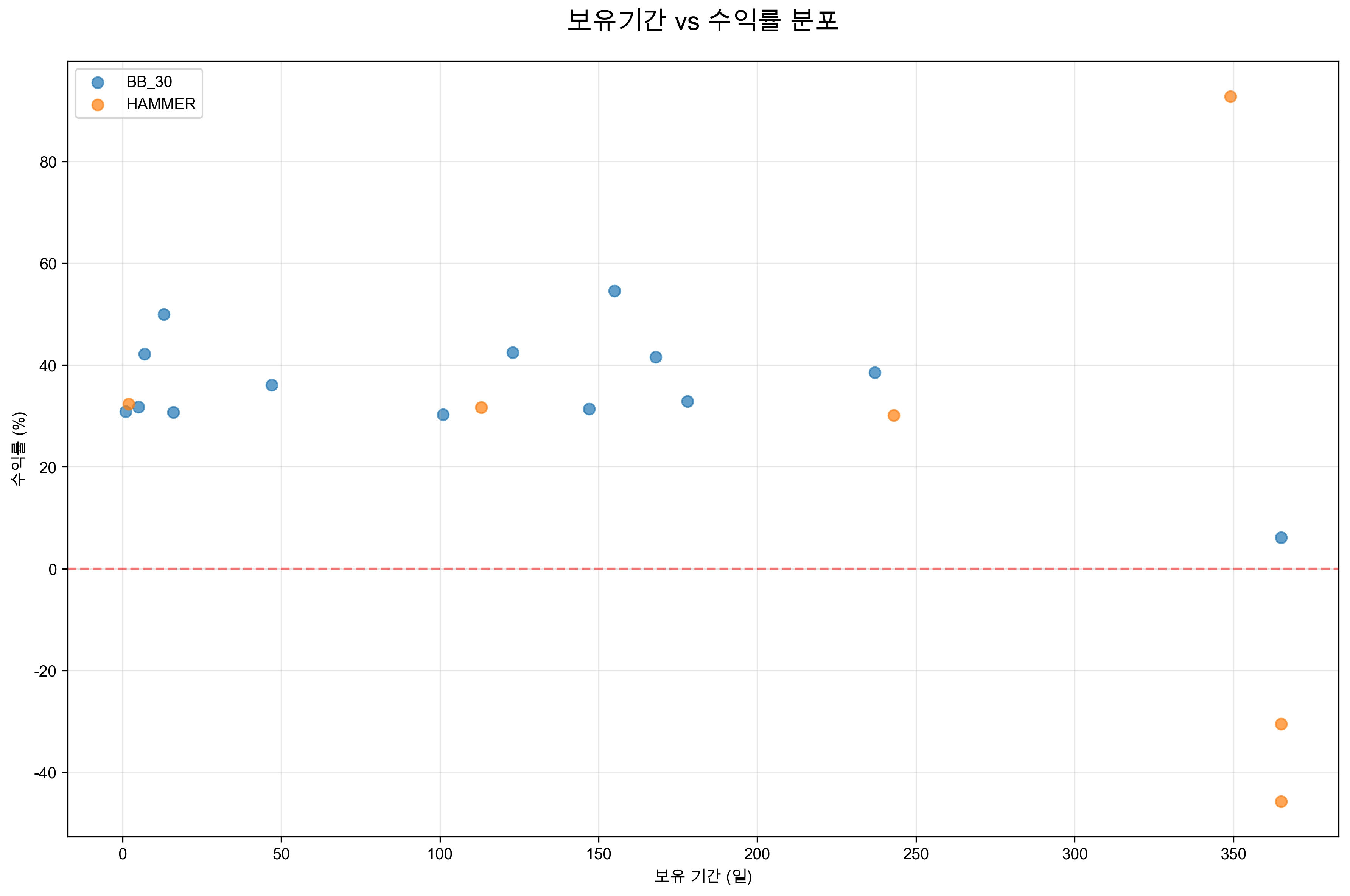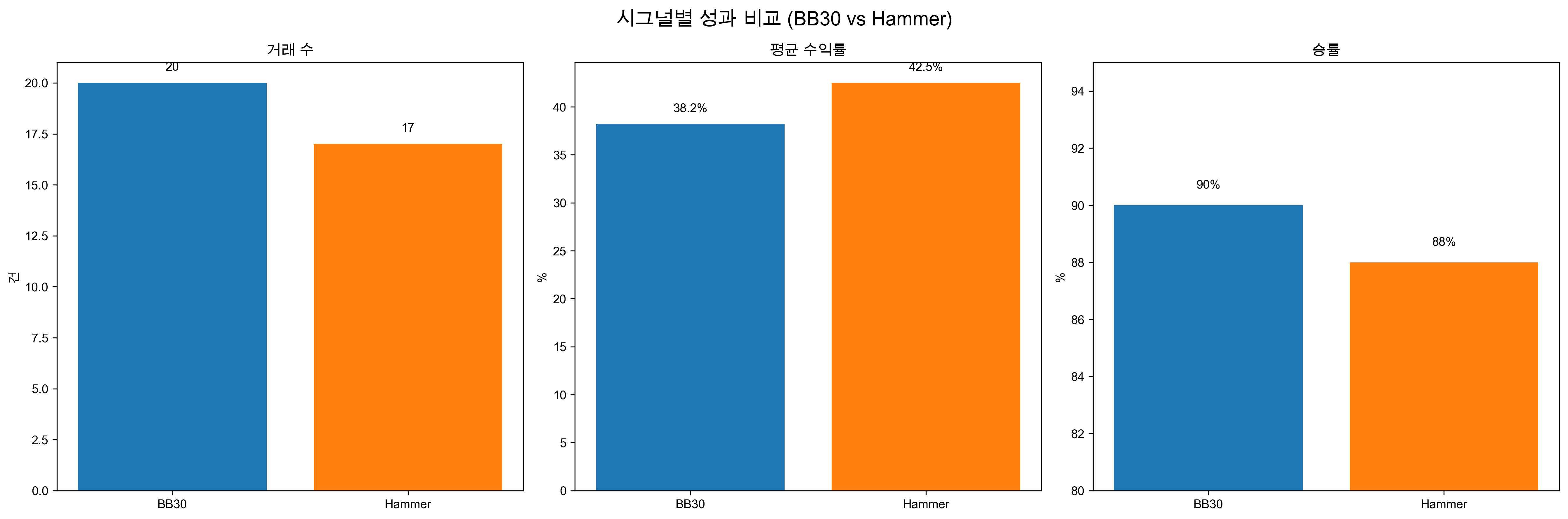 | 시그널 | 거래 수 | 승률 | 평균 수익률 | | BB30 | 20건 | 90.0% | 27.7% | | Hammer | 17건 | 100.0% | 45.7% |