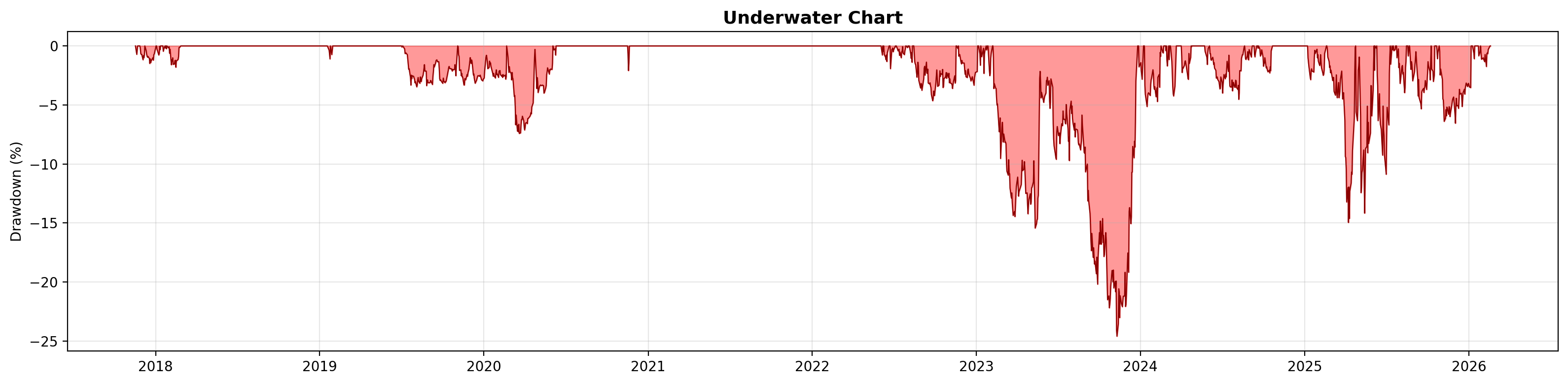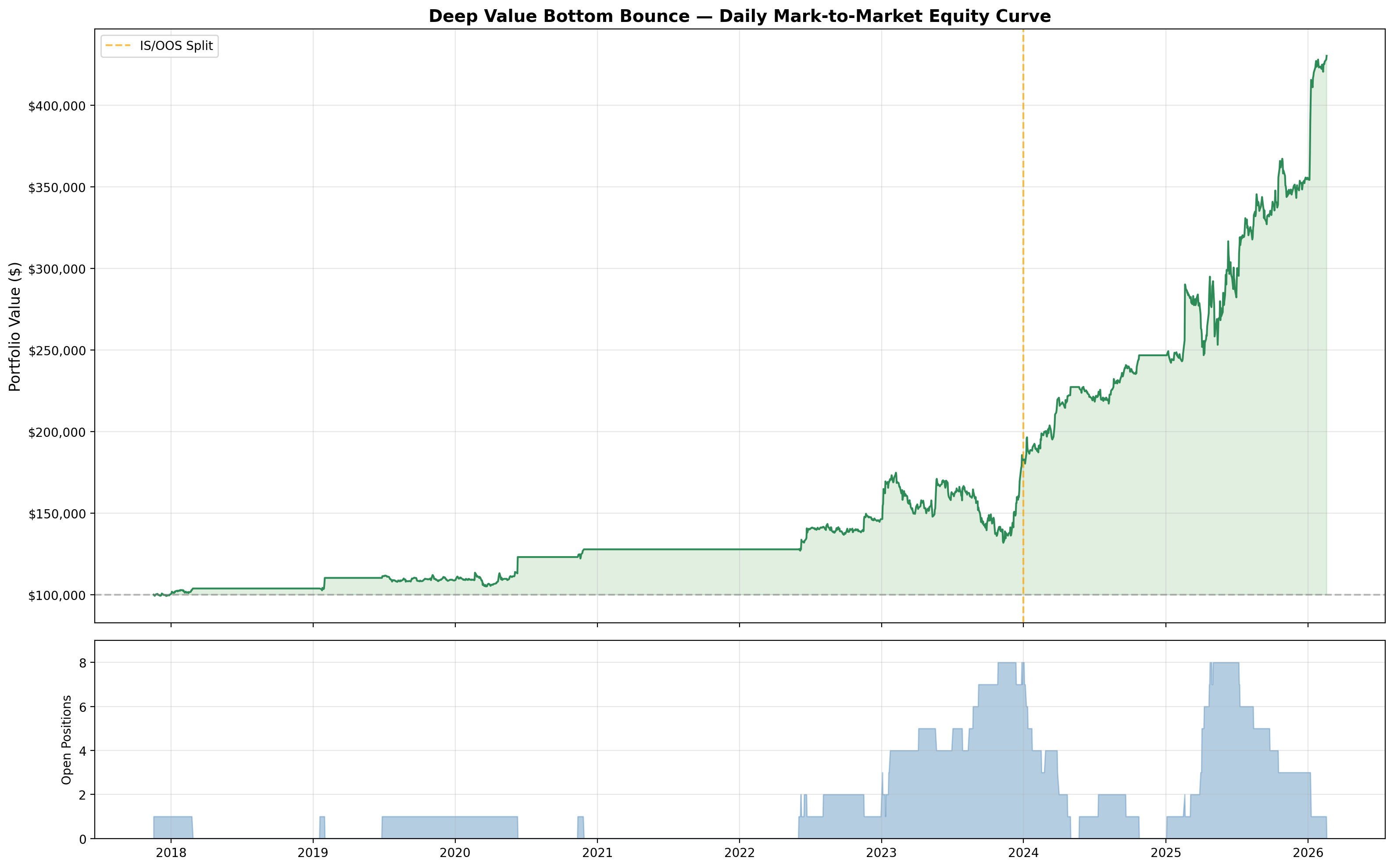 | 지표 | 값 | | 백테스트 기간 | 2016-01 ~ 2025-06 (9.5년) | | IS Sharpe Ratio | 1.23 | | OOS Sharpe Ratio | 1.62 | | 총 수익률 (MTM) | +330.3% | | CAGR | ~19% | | Max Drawdown (Daily) | -24.6% | | 승률 | 89% (33/37 거래) |