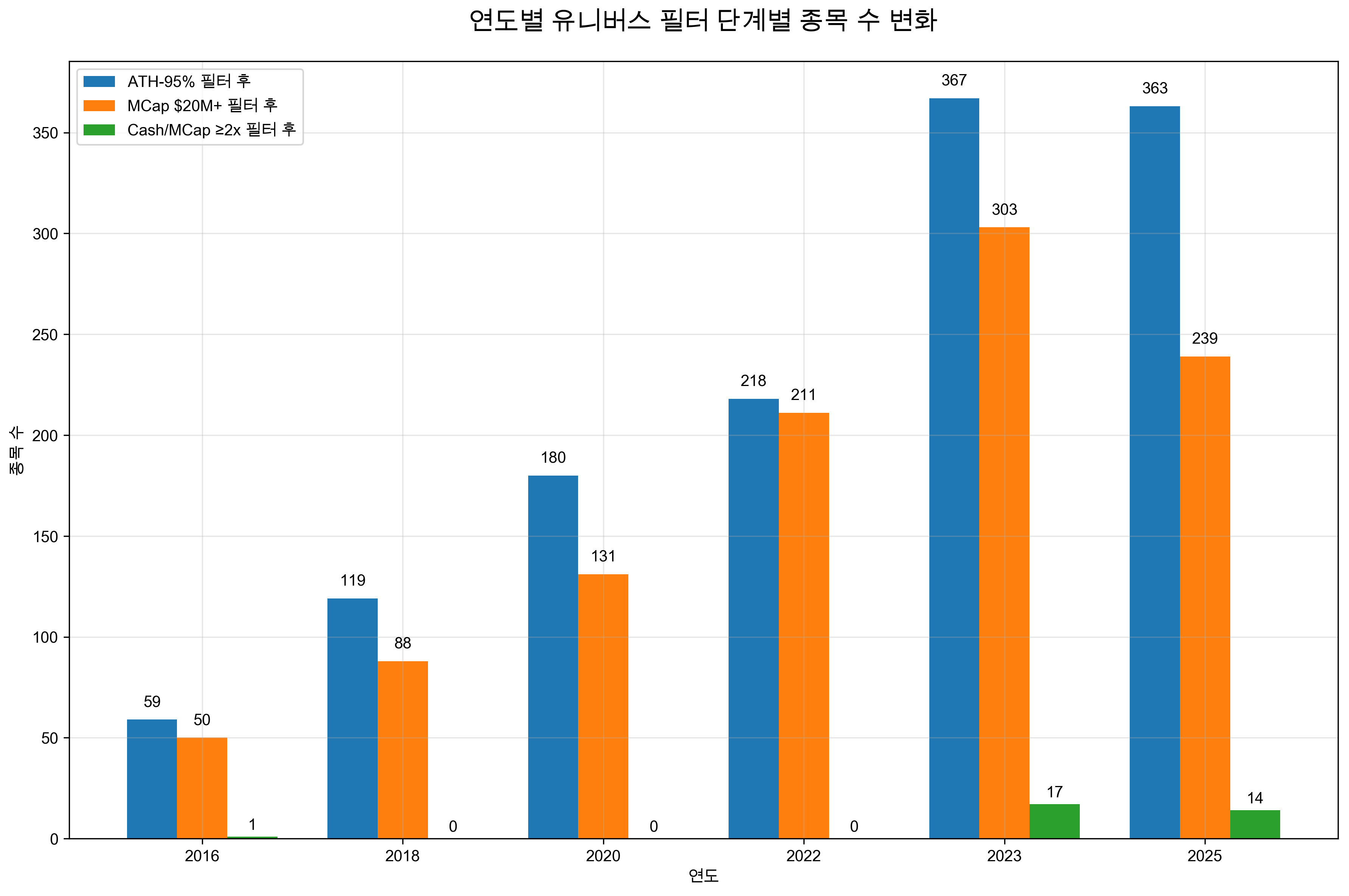 - Cash/MCap ≥ 2x 필터가 핵심 → 2022-23 금리인상 크래시 때 대량 발굴