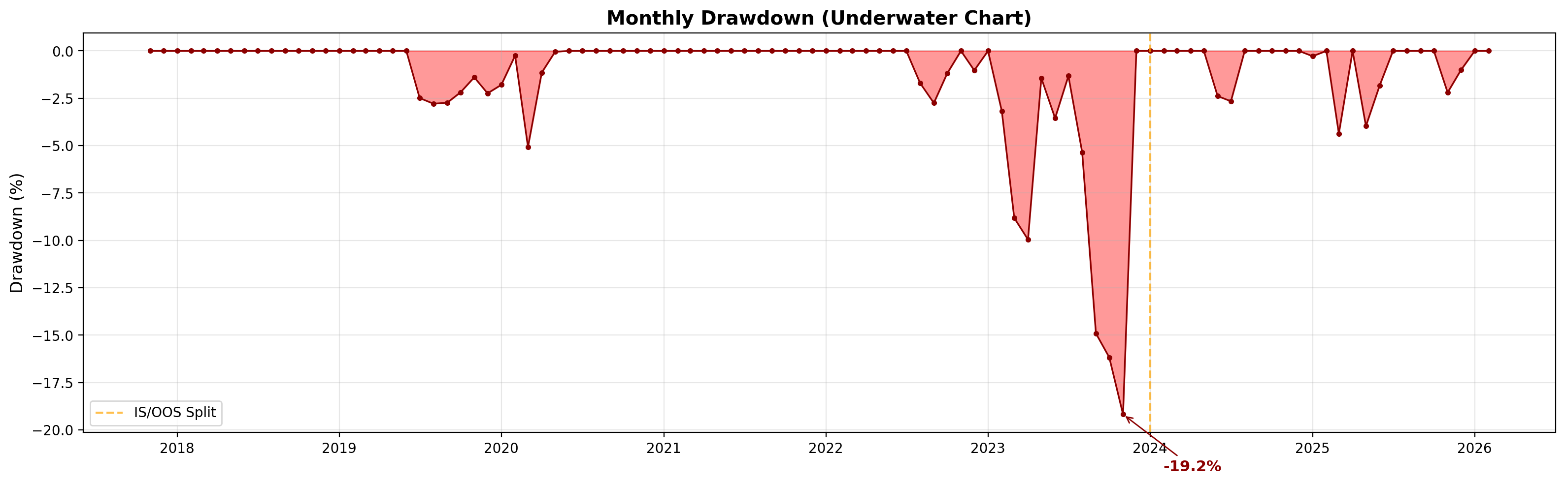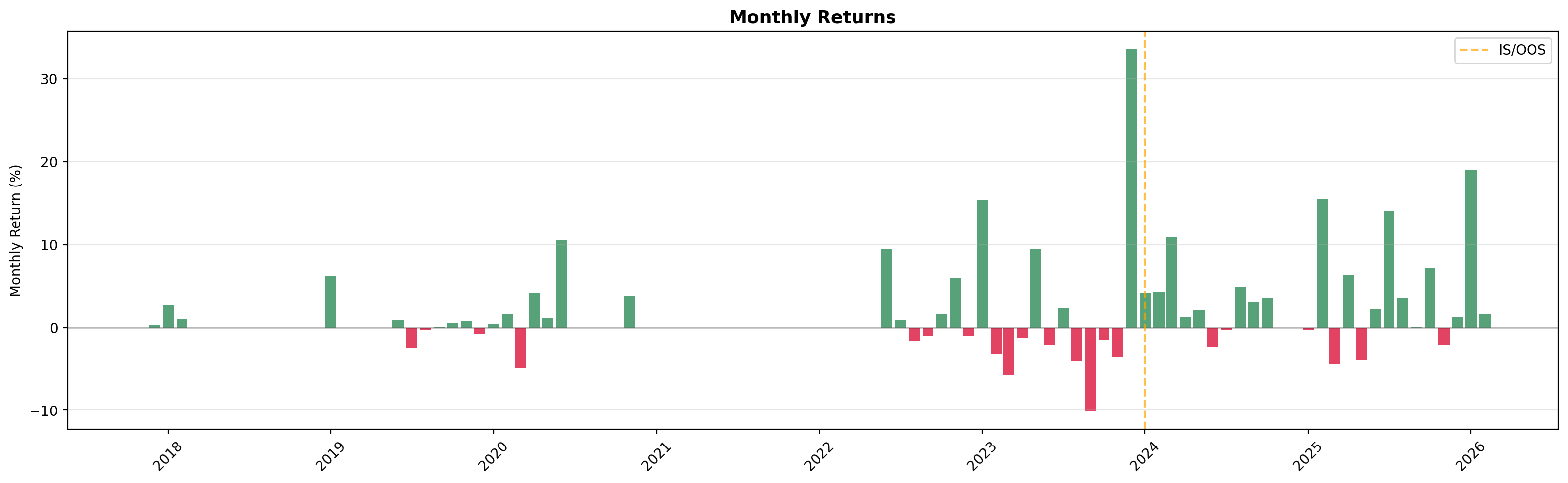 - OOS Sharpe 1.62 > IS Sharpe 1.23 → 과적합이 아닌 진짜 알파