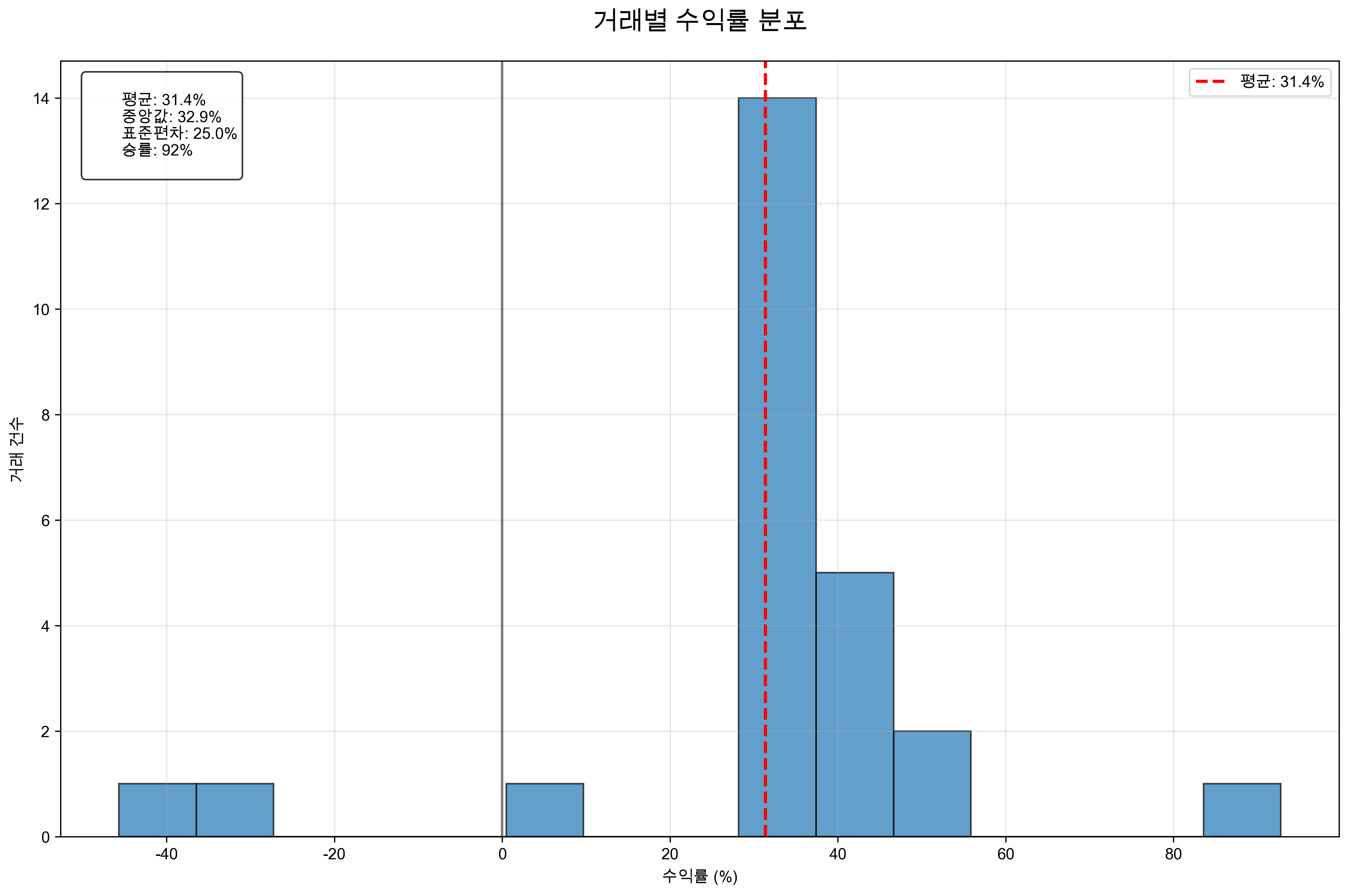 | 지표 | 값 | | 총 거래 수 | 37건 | | 승률 | 94.6% (35/37) | | 평균 수익률 | 36.0% | | 평균 보유기간 | 137일 | | 총 PnL | $399,635 |