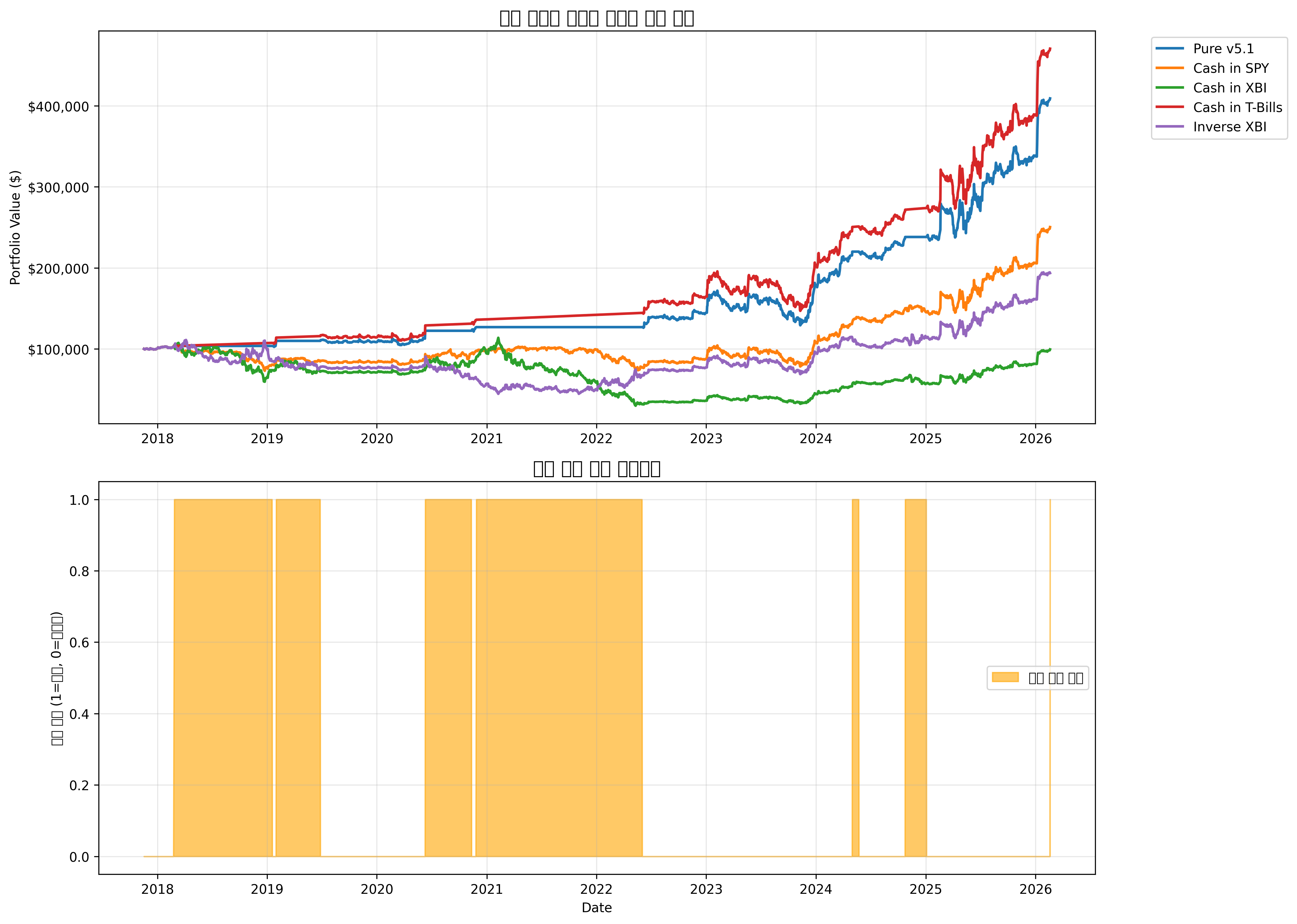 | 전략 | 총수익률 | CAGR | 최대낙폭 | 샤프비율 | | Pure v5.1 | 309.2% | 18.7% | -24.9% | 0.89 | | Cash in SPY | 150.4% | 11.8% | -30.3% | 0.46 | | Cash in XBI | -0.6% | -0.1% | -73.7% | -0.01 | | Cash in T-Bills | 370.6% | 20.7% | -24.9% | 0.99 | | Inverse XBI | 93.6% | 8.4% | -59.9% | 0.28 |