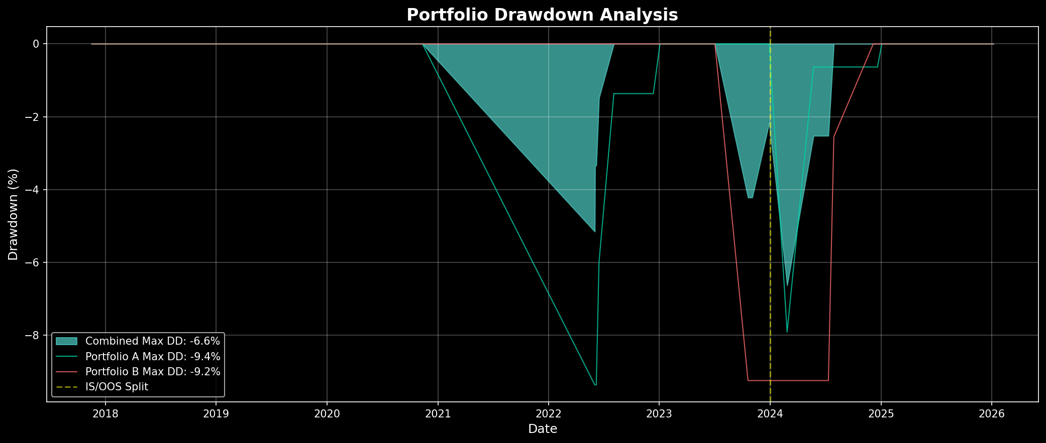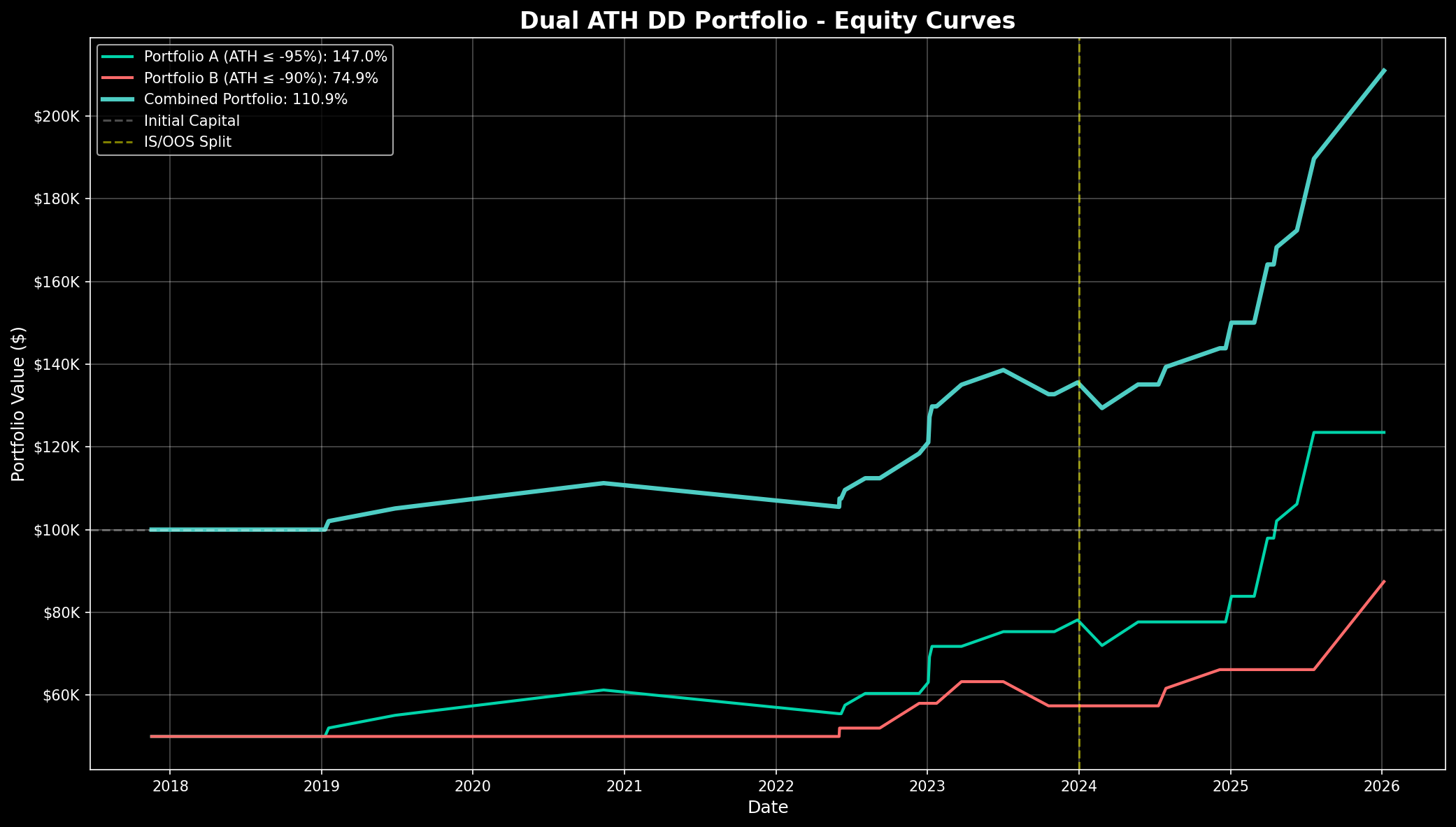- Key Finding: 듀얼 ATH DD 포트폴리오로 110.9% 수익률 달성. Portfolio A(-95%): 147.0%, Portfolio B(-90%): 74.9%. 리스크 분산으로 최대낙폭 -6.6%로 감소.