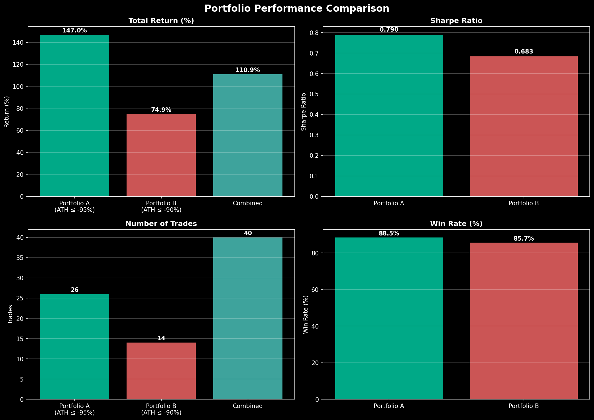 Portfolio A (ATH ≤ -95%): 147.0% 수익률, Sharpe 0.790, 26건 거래