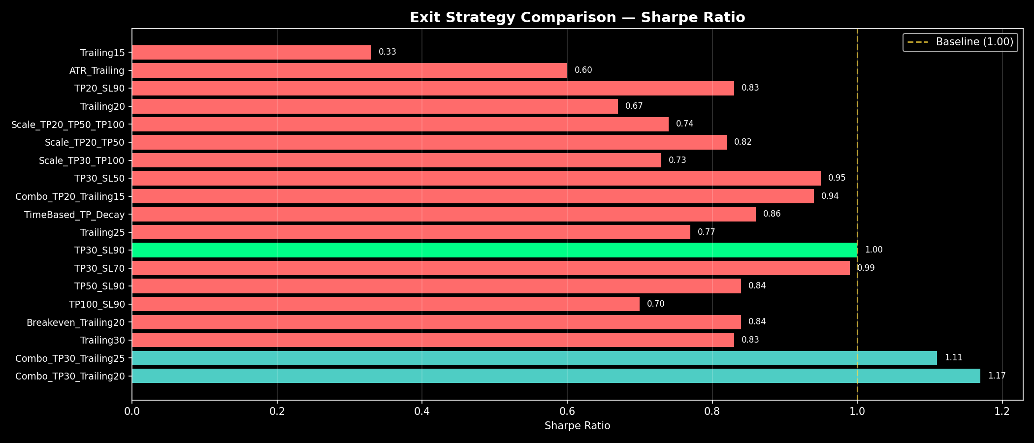 | ์์ | ์ ๋ต | ์์ต๋ฅ | MaxDD | Sharpe | ์น๋ฅ | | 1 | Combo_TP30_Trailing20 โญ | +287.0% | -29.0% | 1.17 | 93.1% | | 2 | Combo_TP30_Trailing25 | +263.0% | -31.7% | 1.11 | 92.9% | | 3 | Trailing30 | +256.2% | -43.4% | 0.83 | 48.5% | | 4 | Breakeven_Trailing20 | +179.0% | -35.3% | 0.84 | 63.3% | | 5 | TP100_SL90 | +170.9% | -54.3% | 0.70 | 70.0% | | 6 | TP50_SL90 | +165.4% | -40.5% | 0.84 | 83.3% | | 7 | TP30_SL70 | +161.5% | -22.8% | 0.99 | 90.3% | | 8 | TP30_SL90 [BASE] | +160.9% | -20.0% | 1.00 | 93.3% | | 9 | Trailing25 | +160.7% | -39.1% | 0.77 | 41.7% | | 10 | TimeBased_TP_Decay | +153.1% | -19.6% | 0.86 | 85.7% | | 11 | Combo_TP20_Trailing15 | +152.5% | -27.8% | 0.94 | 93.3% | | 12 | TP30_SL50 | +136.9% | -32.0% | 0.95 | 84.8% | | 13 | Scale_TP30_TP100 | +120.4% | -36.9% | 0.73 | 68.4% | | 14 | Scale_TP20_TP50 | +110.6% | -29.3% | 0.82 | 83.3% | | 15 | Scale_TP20_TP50_TP100 | +108.5% | -37.6% | 0.74 | 73.7% | | 16 | Trailing20 | +103.5% | -32.8% | 0.67 | 41.0% | | 17 | TP20_SL90 | +97.3% | -19.1% | 0.83 | 93.9% | | 18 | ATR_Trailing | +78.8% | -24.7% | 0.60 | 36.8% | | 19 | Trailing15 | +27.2% | -26.3% | 0.33 | 36.6% |