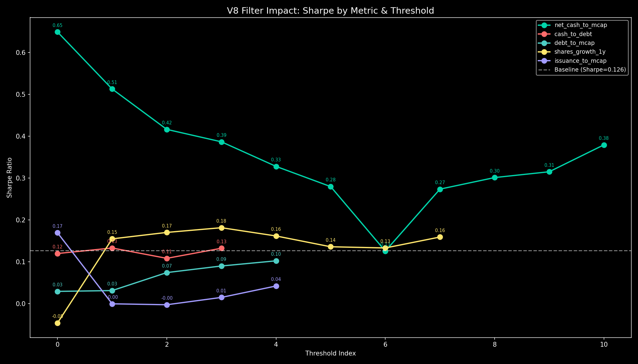 - cash_to_debt: Nearly all thresholds produce Sharpe 0.10-0.13, barely different from baseline 0.126. The metric is too skewed (median 6.5x) to be discriminative.