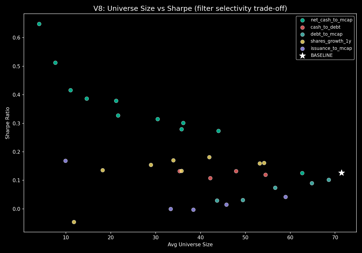 Consider adding shares_growth_1y ≤ 20% as a soft secondary filter — it improves mean return modestly (+14.6% vs +10.3%) with good OOS consistency. However, when combined with net_cash_to_mcap, the marginal benefit disappears (combo Sharpe 0.540 < solo 0.649), so it’s only useful if replacing the cash/mcap filter, not supplementing it.