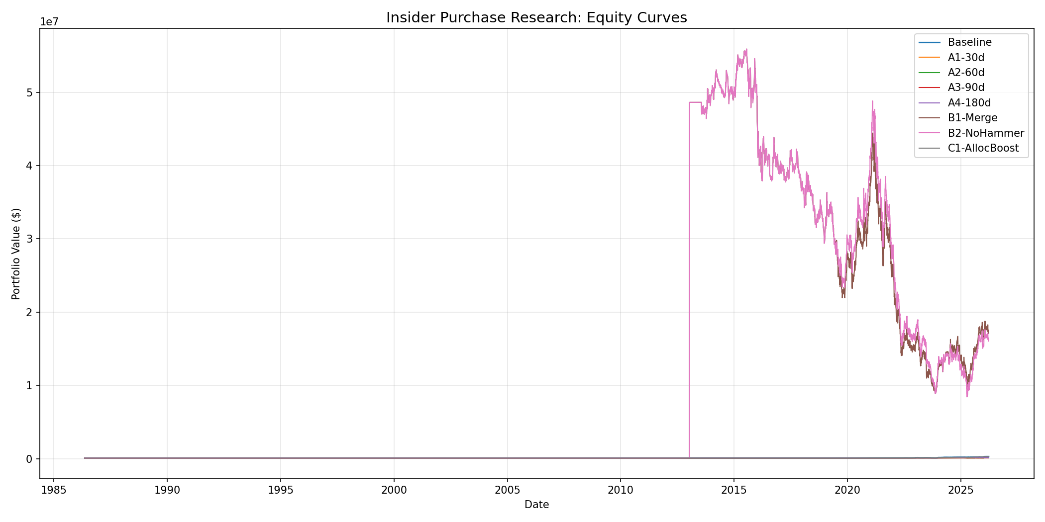내부자 매수를 독립 시그널로 추가. 거래수 132-135건으로 대폭 증가. 총수익률은 +16,000%대로 폭발적이지만, WR 66.7%로 하락하고 MaxDD -84%로 매우 위험. 내부자 매수 시그널 자체의 품질이 BB30/Hammer보다 낮음. 일부 종목(AVTX, RZLT 등)에서 큰 손실 발생.