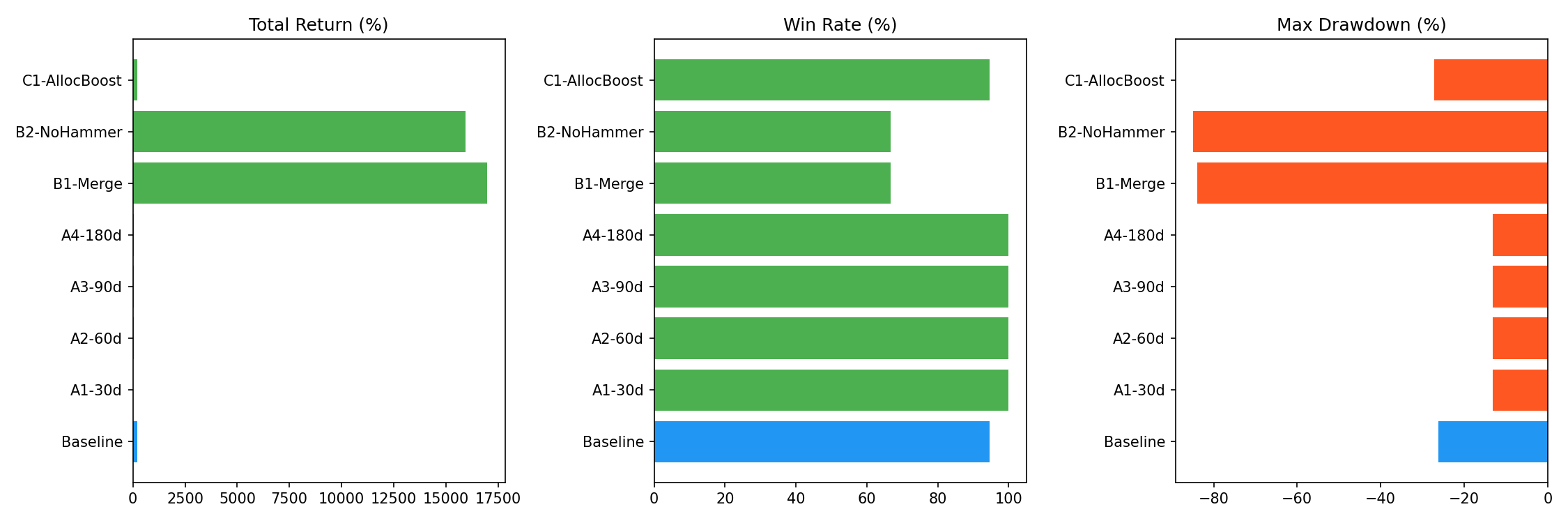 | B2-NoHammer | 135 | 66.7% | +15,946% | 13.6% | -84.9% | 0.16 |