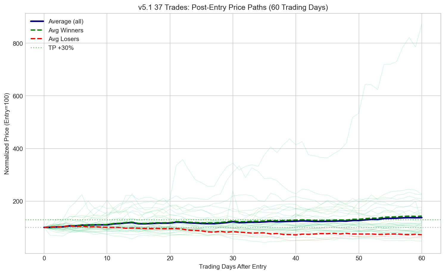• 전체 37건 중 승자(TP 달성): 34건 / 패자: 3건 • 평균 최저점 도달일: 25.3일 (중앙값 26일) • 평균 최저점 깊이: -17.3% (중앙값 -15.7%) • TP(+30%) 60일 내 달성: 19건, 평균 18일