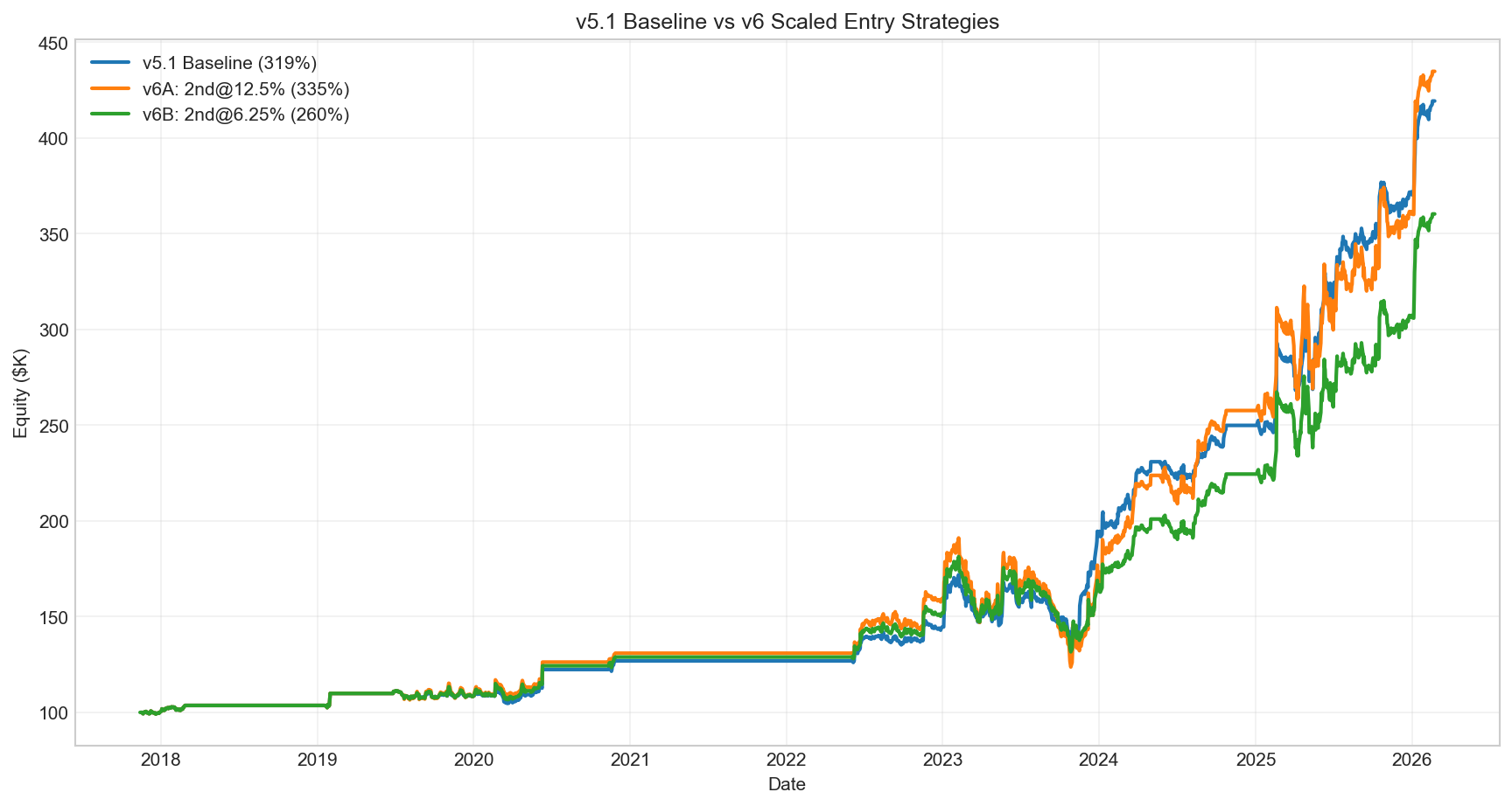 📊 v6B: 2차 진입 6.25% (절반 배분) • 최종 자산: $360,338 | 총 수익률: +260.3% • 거래 43건 | 승률 93.0% | 최대 낙폭 -27.4%