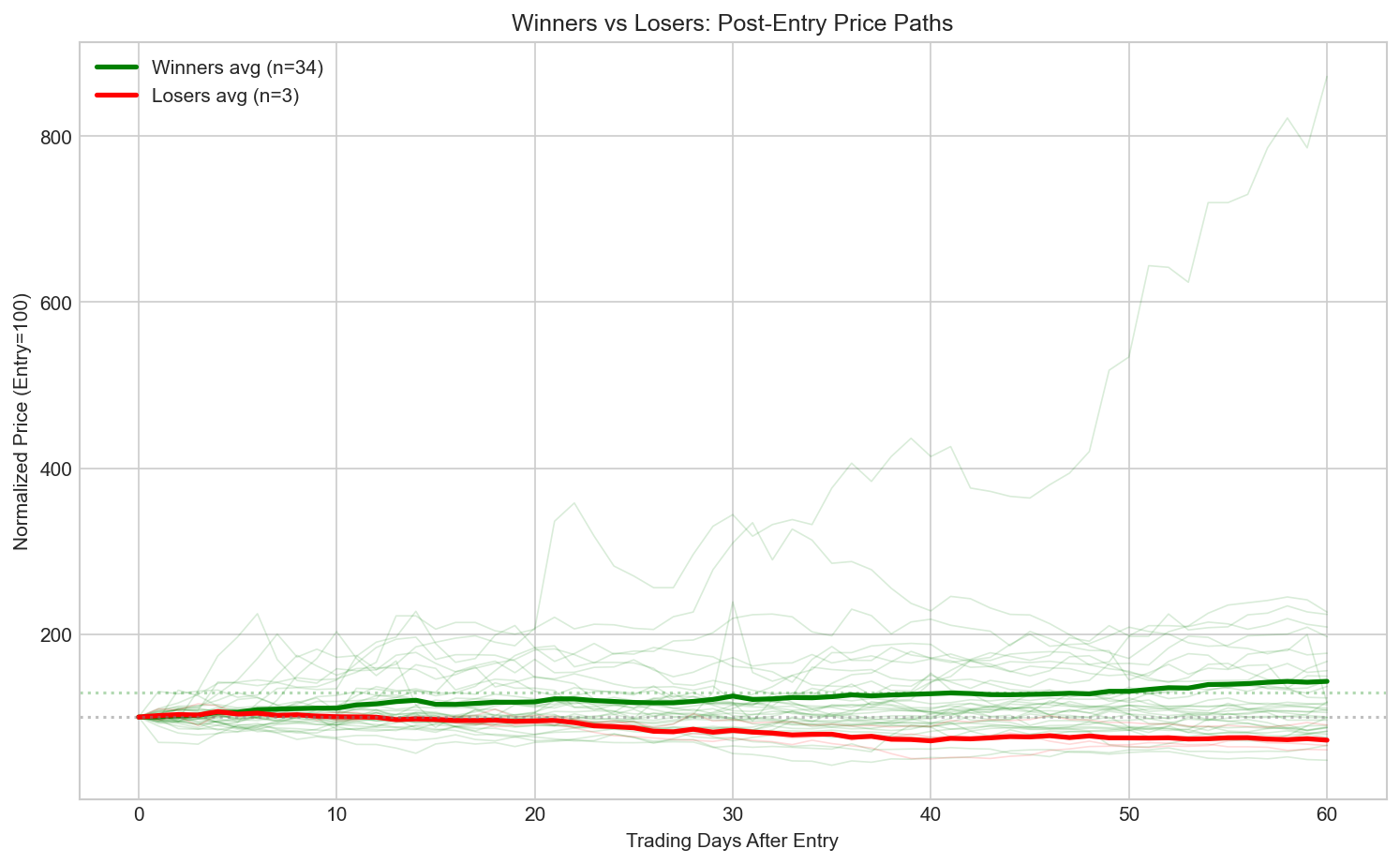 37건 각각에 대해 entry 이후 60 거래일간 정규화된 가격 경로를 분석.