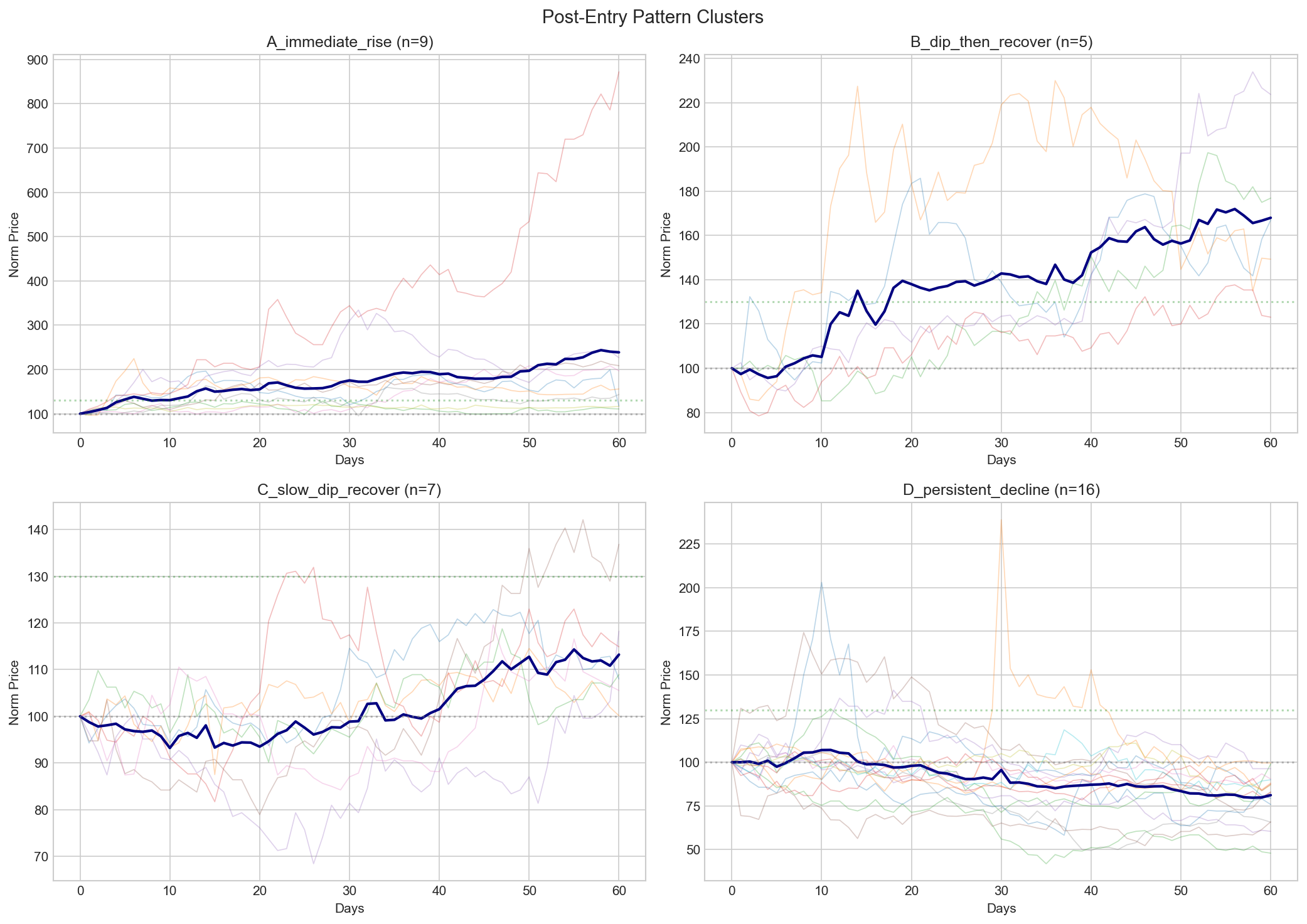 4가지 패턴으로 분류: • A_즉시상승 (9건): 최저 -1.3%, 60일 수익 +138.7% — 2차 진입 불필요 • B_하락후반등 (5건): 최저 -13.3%, 60일 수익 +68.0% — 10일 내 dip, 빠른 회복 • C_느린하락회복 (7건): 최저 -16.5%, 60일 수익 +13.2% — 10일 이후 저점 • D_지속하락 (16건): 최저 -28.0%, 60일 수익 -18.8% — 장기 하락 (대부분 결국 TP 달성)