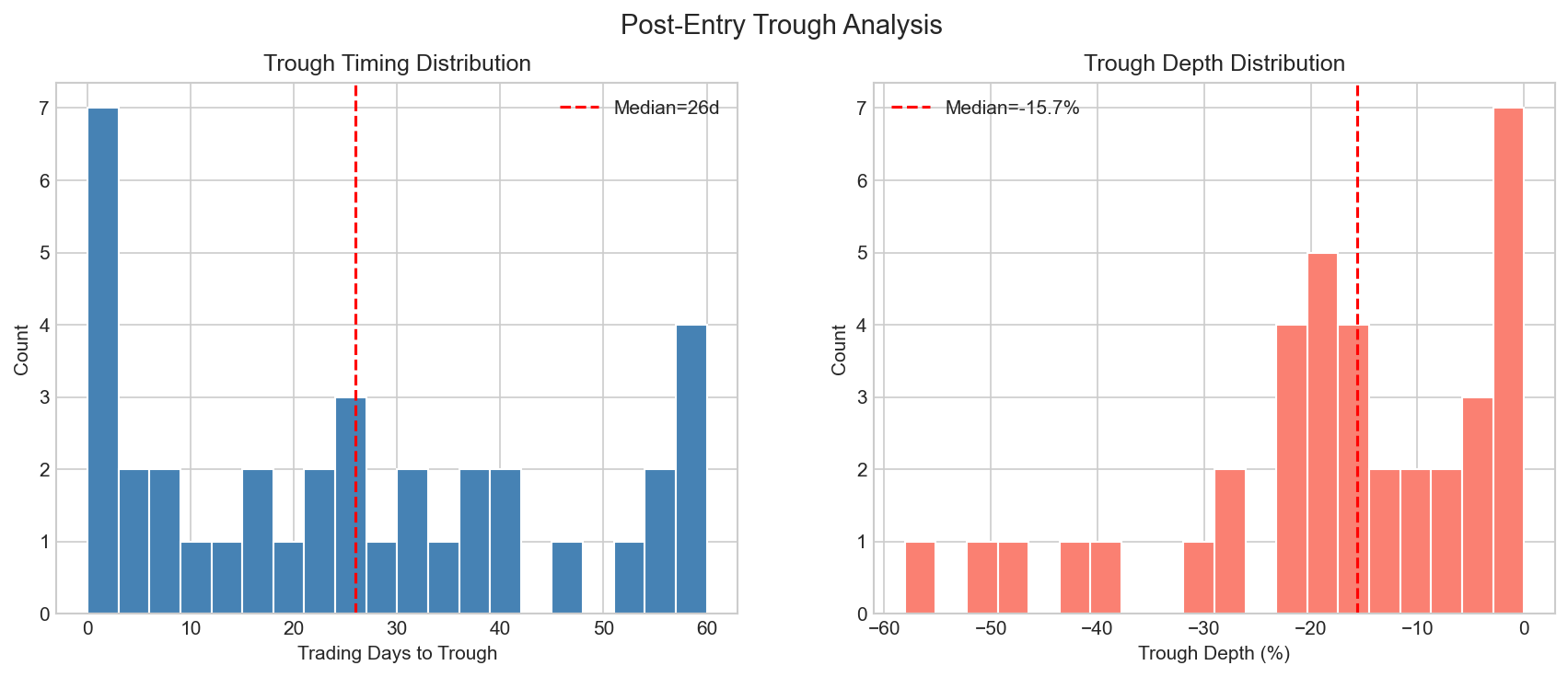 핵심 발견: • 37건 중 24건(65%)이 진입 후 10% 이상 하락 경험 • 하락 종목의 88%(21/24)가 최종적으로 TP 달성 → 추가 진입 시 높은 성공률 기대 • 중앙값 최저점이 26일째 → 진입 후 3~4주에 2차 진입 기회 집중 • 기술적 시그널: SMA20 하회(95% 이상 하락), BB 하단 터치, 20일 신저가+거래량 급증